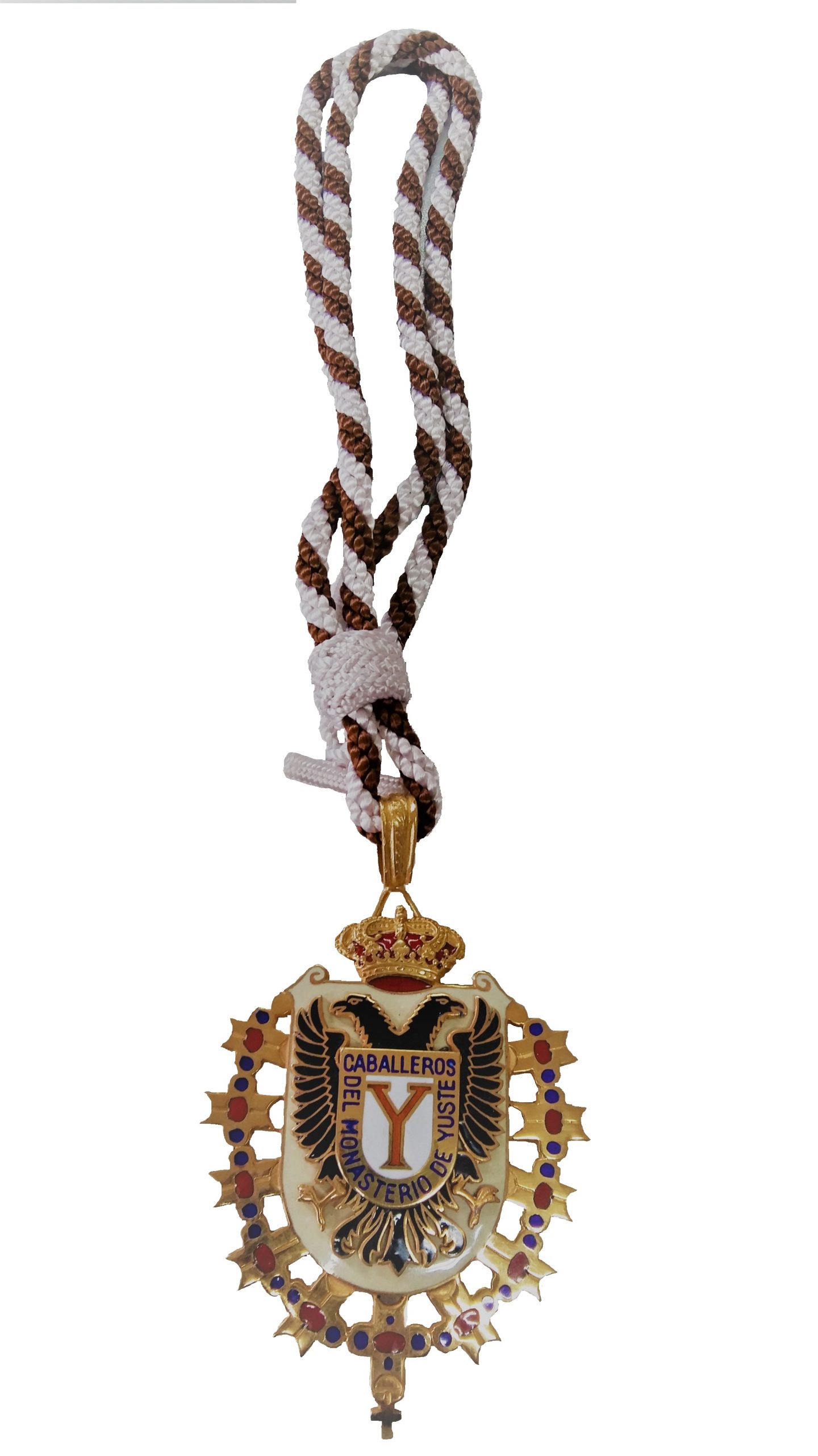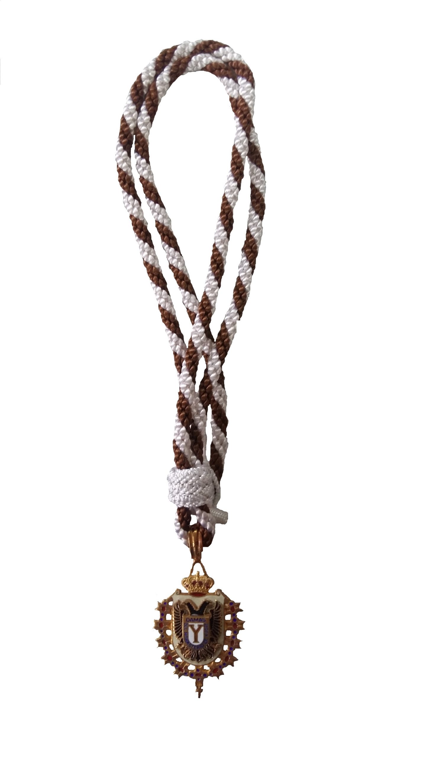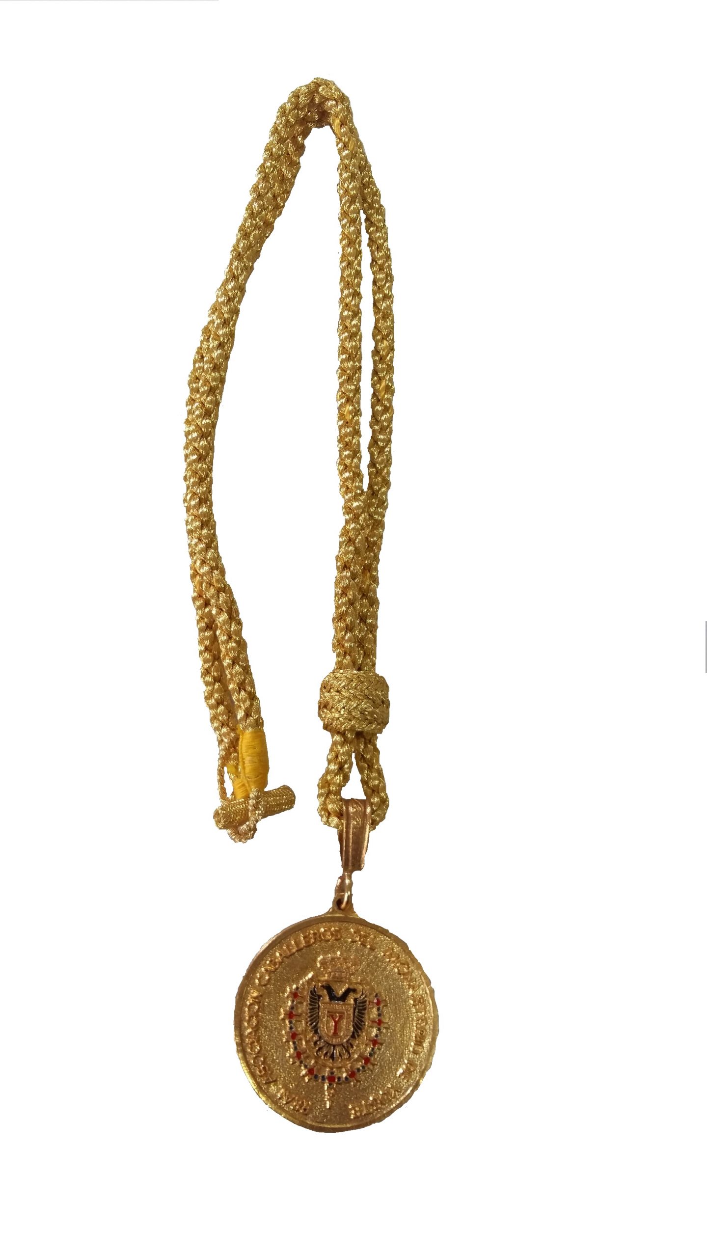 Aleación de bronce de alta fusión, chapada en oro de 18 quilates con 3 micras de grosor, esmaltada. Se coloca al cuello. Es necesaria para el acto de Investidura.
